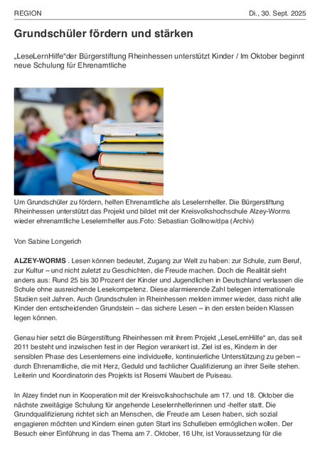„LeseLernHilfe“der Bürgerstiftung Rheinhessen unterstützt Kinder / Im Oktober…